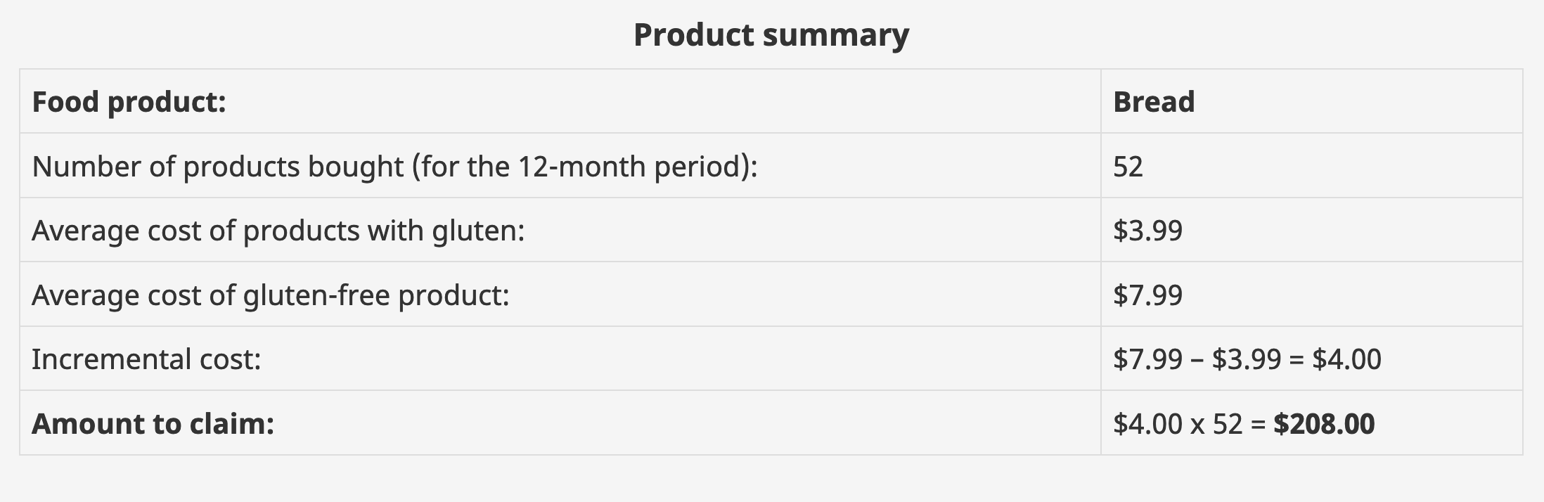 The next nuance of the legality is the full cost of a GF product cannot be claimed as tax-credit. Only the difference in the cost of the GF and non-GF version of the product can be claimed. To illustrate: if GF bread costs $7.99 and non-GF bread costs $3.99, only $4.00 (7.99 - 3.99) can be claimed as tax-credit.